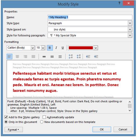 Here is the definition of my Custom Heading 1 Style. I have set it to red and bold to maximize the contrast. Note that it is based on ‘(no style)’ and the ‘style to follow’ is set to be my Custom Style for regular text.