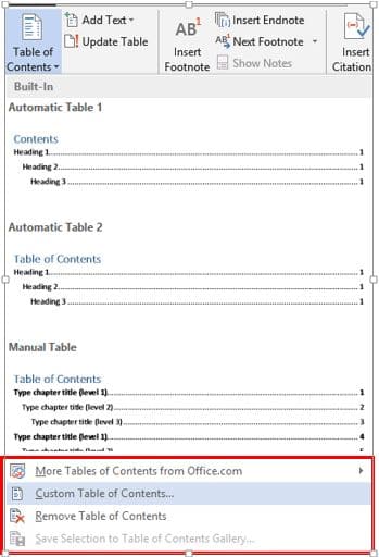 But, because my Custom Heading Styles are independent of the Built-in Styles, I need to create a Custom Table of Contents. To do this I select the ‘Table of Contents’ dropdown on the ‘References Tab’. Scroll to the bottom of the dropdown and click ‘Custom Table of Contents…”